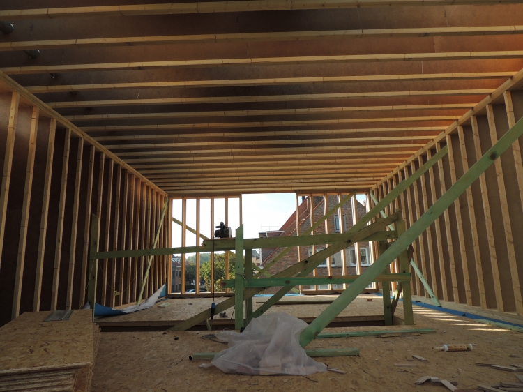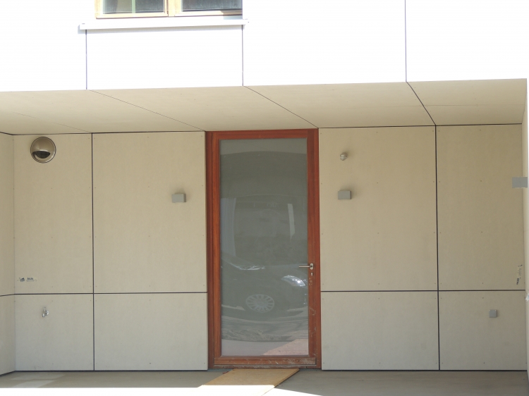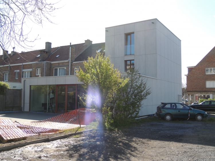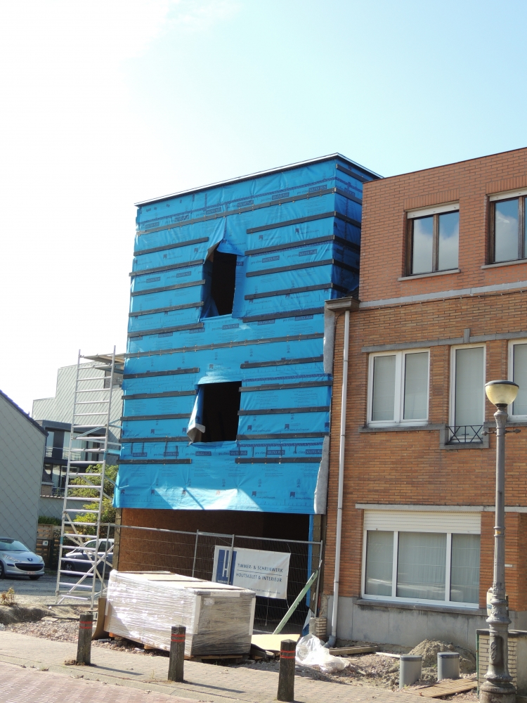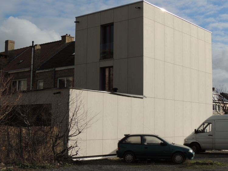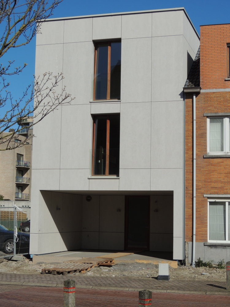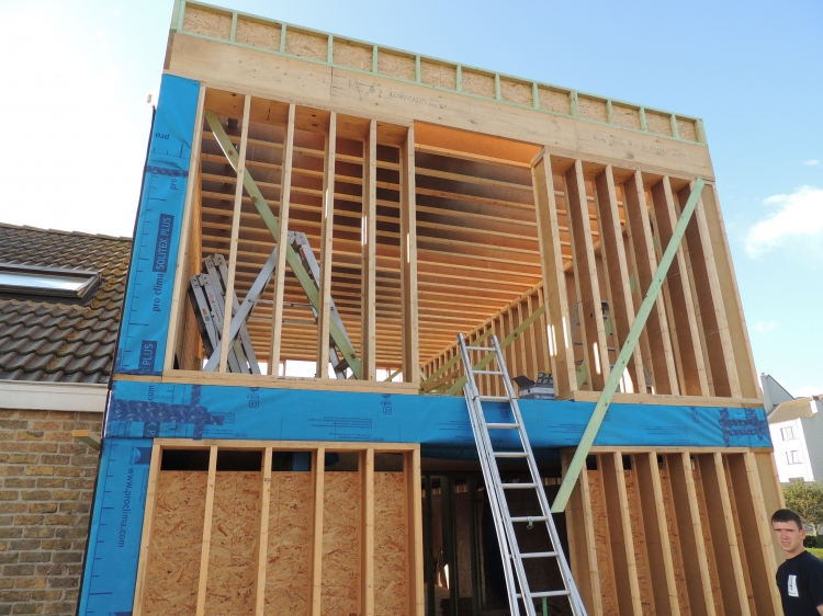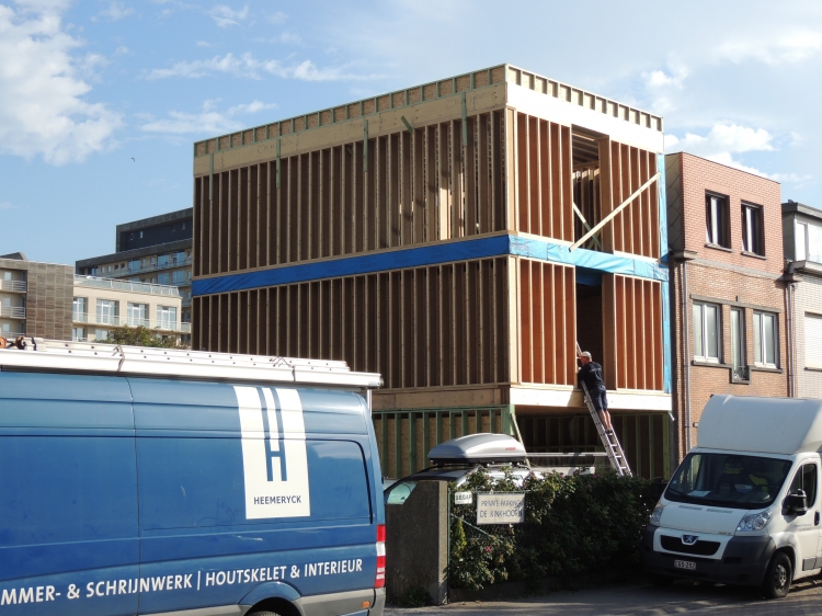 Houtskeletwoning met 2 verdiepen in opbouw met een wandstructuur 300 mm dmv Steico en ultralam. Laagenergie schrijnwerk 88 mm profilering in Afzelia Doussie met 3 dubbel glas gelaagd K0.5. Gevelbekleding in Eternit beplating.