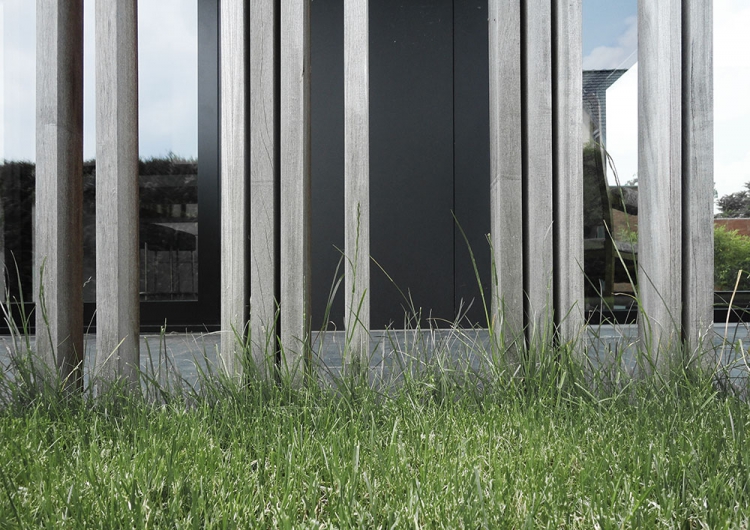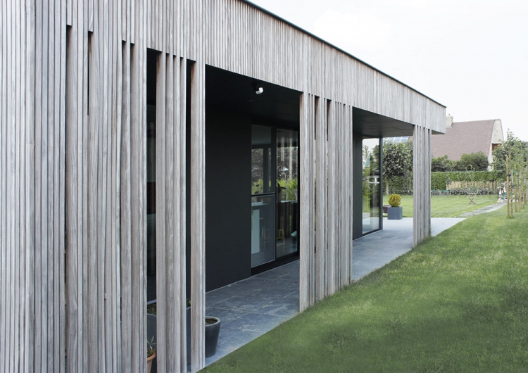 Het leefgedeelte werd opgevat als een open platform die d.m.v. een soort filter zijn afscheiding vindt van de straat en zijn verbinding met de tuin. De wervelende lattenstructuur geeft enerzijds privacy aan de voorgevel en een meer openheid naar de tuin achteraan.