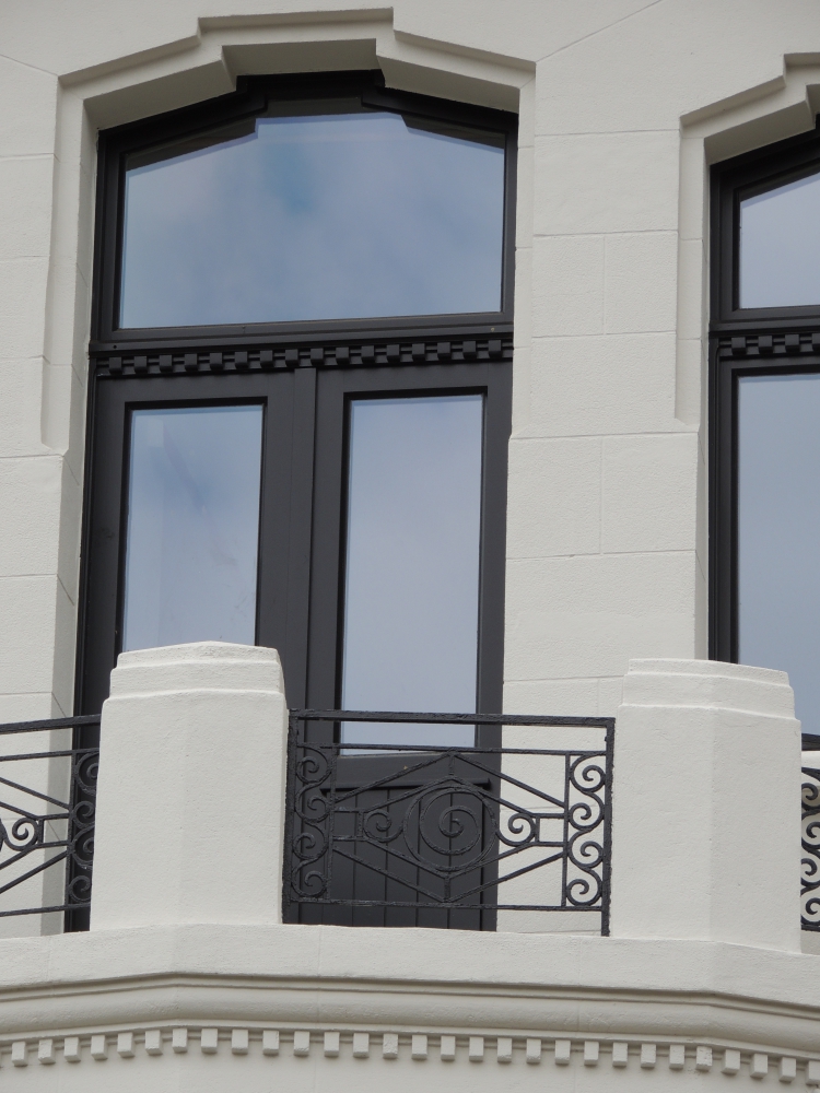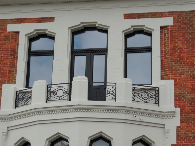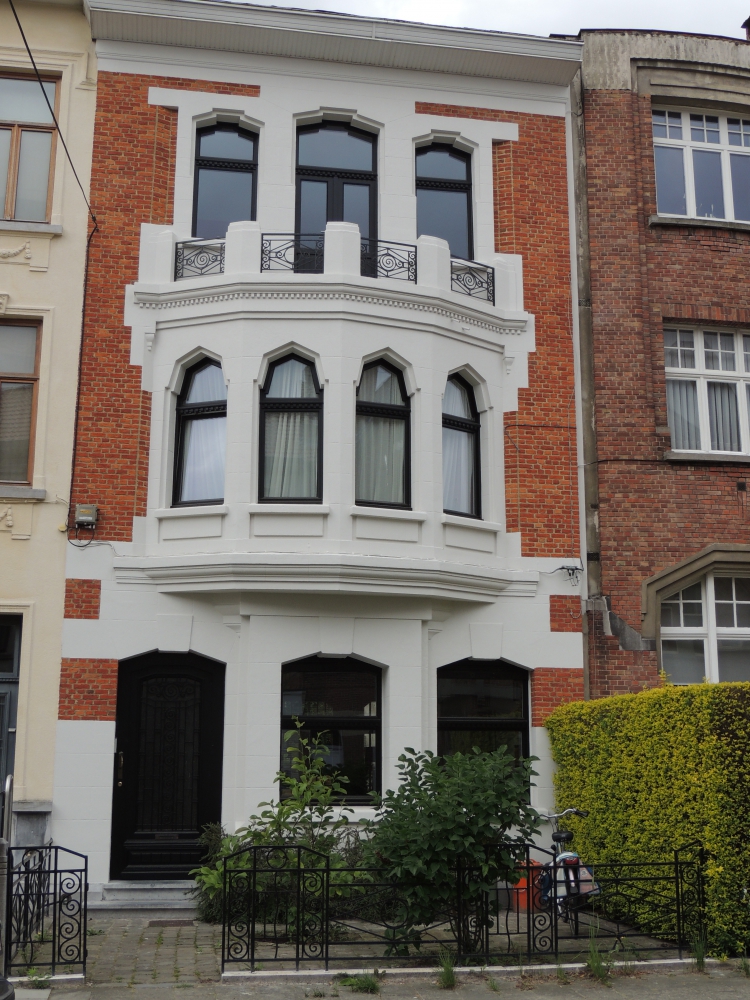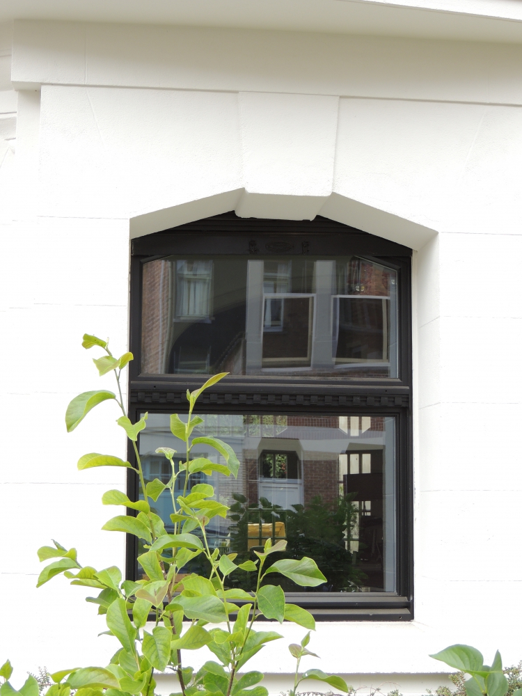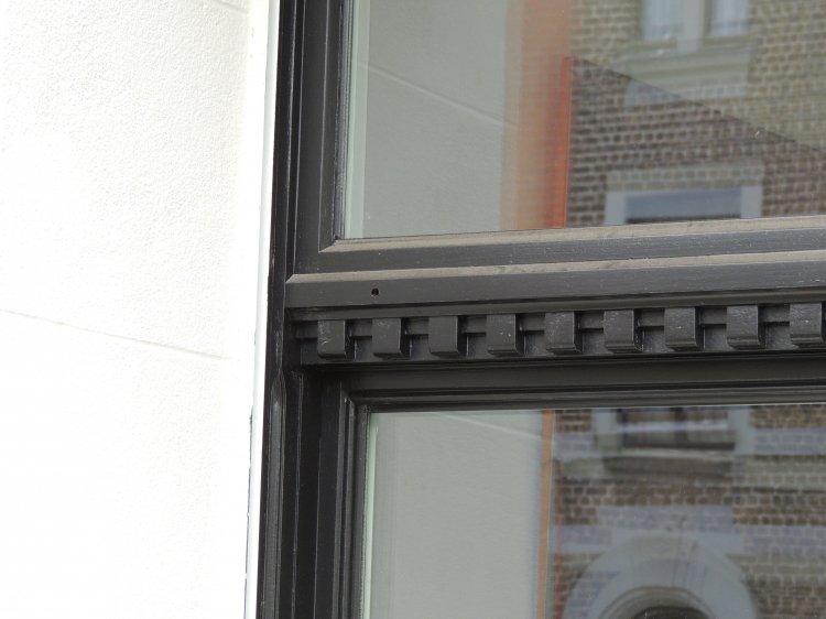 Renovatieschrijnwerk herenhuis te Gent. Nieuw schrijnwerk in Sipo geschilderd met dubbel glas k 1.1 en authentieke buitenprofilering bestaande vervangen schrijnwerk.