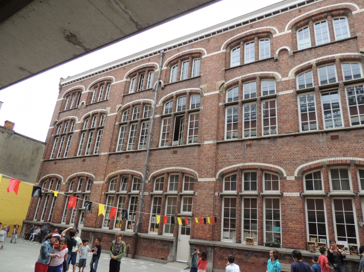 Lagere en secundaire school gelegen in hartje Brussel , St Jans Molenbeek. Renovatie van buitenschrijnwerk klassen. Nieuw buitenschrijnwerk in Afzelia Doussie naar oude model buitenzicht met dubbel glas en ventilatie ( invisiventroosters ) met kleinhoutverdelingen.