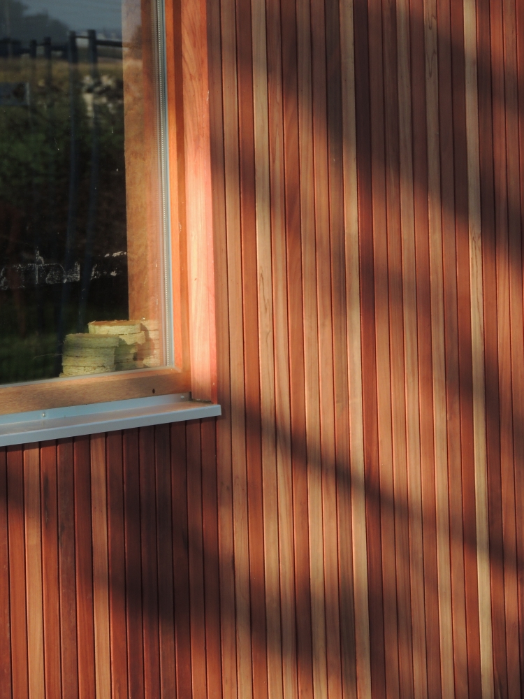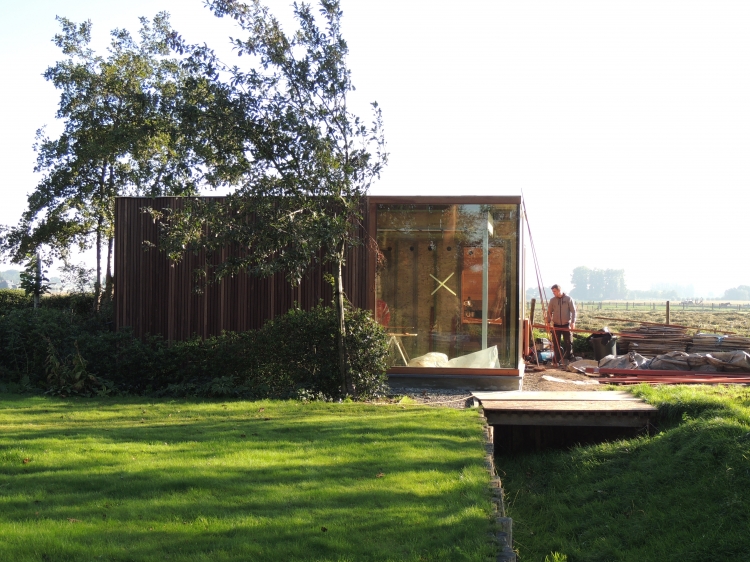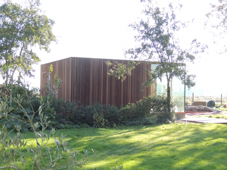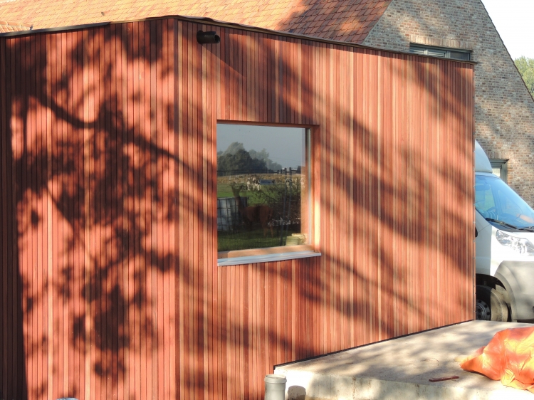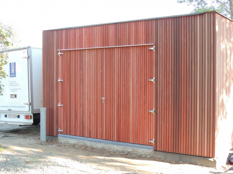 Upgrade voormalige bijgebouwen, tuinhuis en garage in houtskeletbouw met vertikale padoukgevelbekleding.