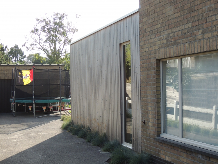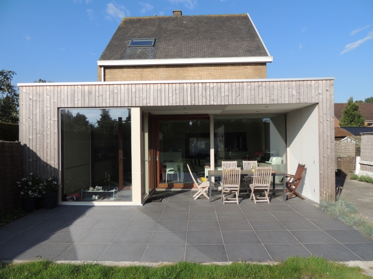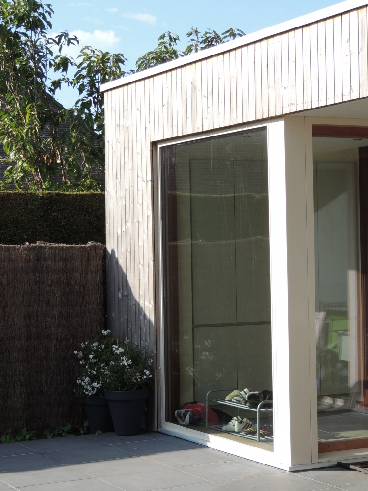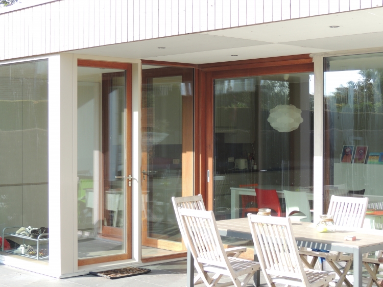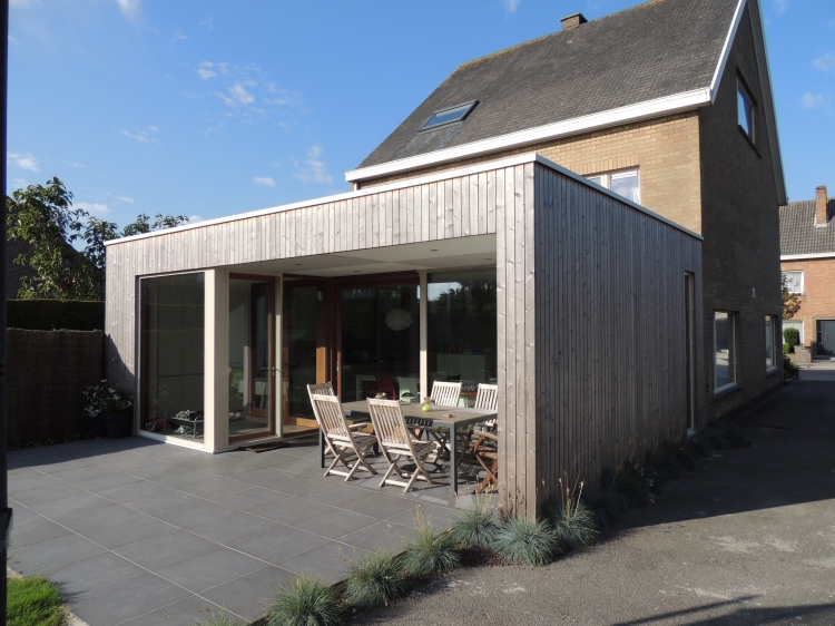 Uitbouw aan achtergevel dmv een houtskeletstructuur met Afzelia Doussie buitenschrijnwerk en gevelbekleding thermowood vertikaal met open voegen.