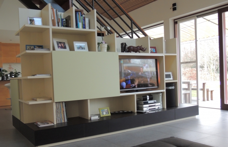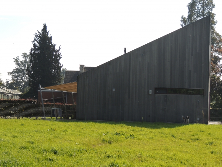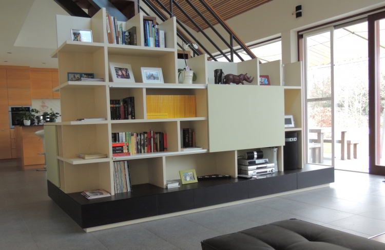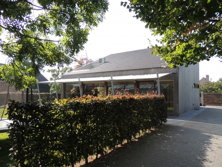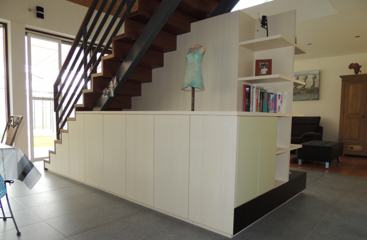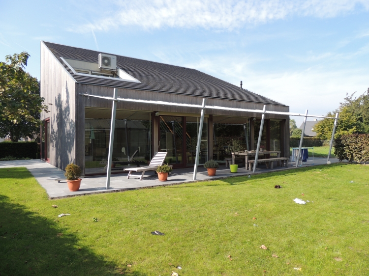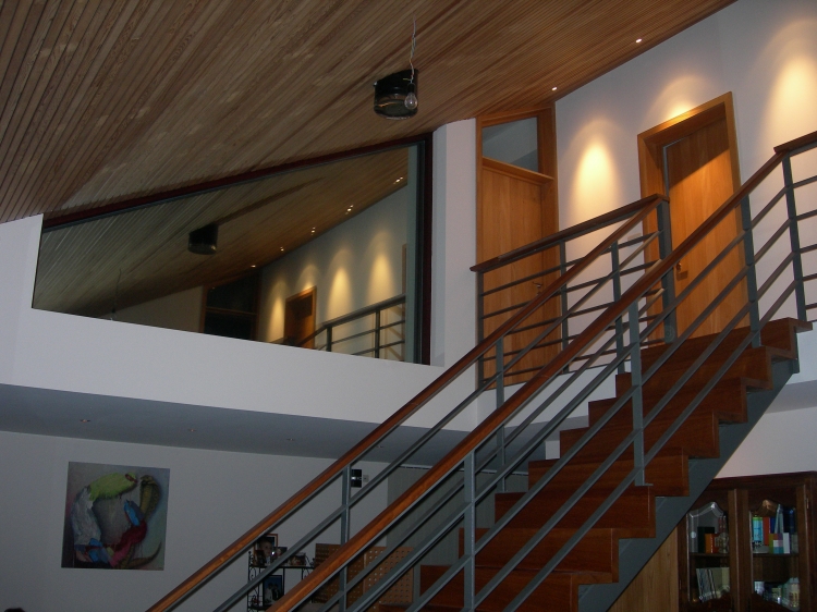 Eengezinswoning opgetrokken in combinatie staal en houtskeletstructuur. Schrijnwerk in hardhout Mukulungu . Interieurfotos met stalen trap en treden iroko waaronder kastgeheel geintegreerd.